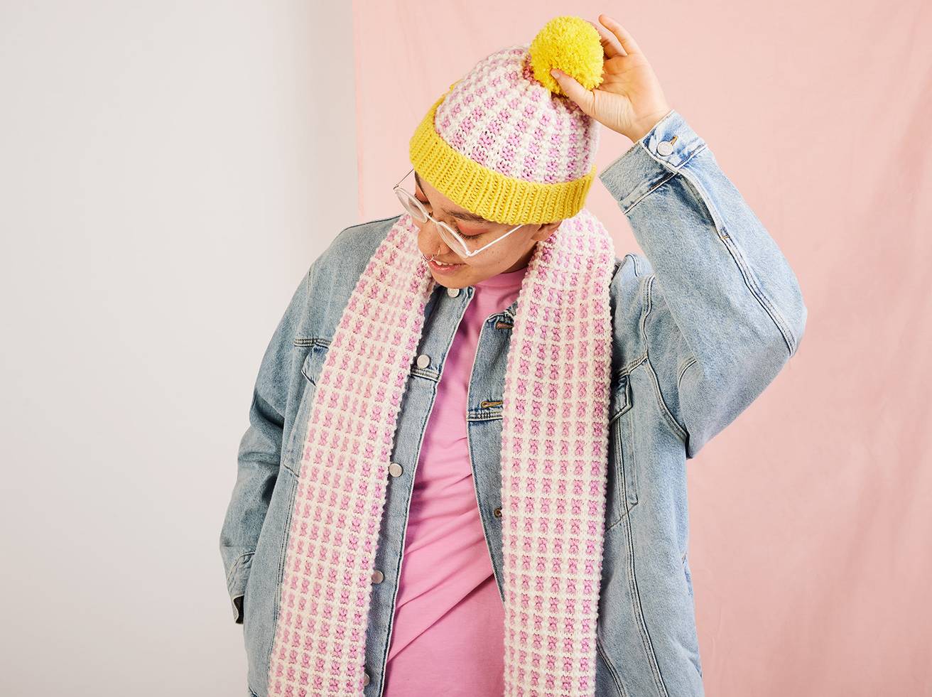 Stay ahead of the fashion trends, and keep your ears warm, with this gorgeous, gridded beanie hat. Choose your 3 favourite shades of Lil’ Merino wool, and knit up a dreamy colour-combination that’s just your style. Make the Polperro Grid Scarf for a matching set.