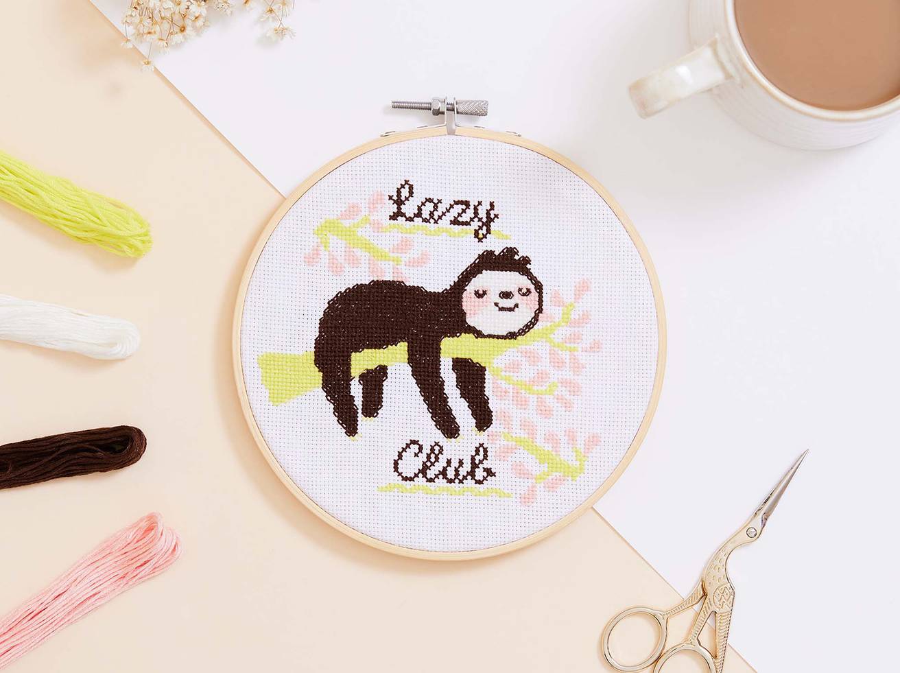 Cross stitch is the perfect way to relax: you can watch your design come to life at a leisurely pace, stitch by stitch. So move slowly, like this sloth, and give yourself some much-needed me time.