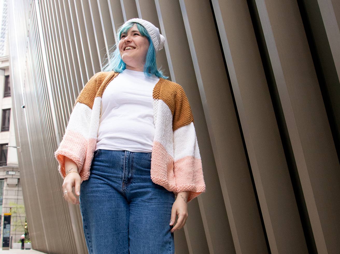 This light and bright jacket has an oversized fit that creates a lovely drape, and is a perfect choice for sunny afternoon walks. Choose your 3 favourite shades of the Lil’ Merino yarn, or make it using just one shade for a simpler colour palette.